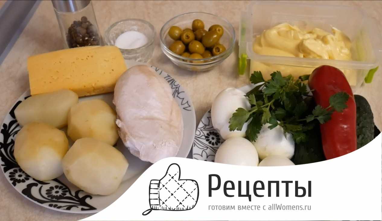 - Закончив с подготовкой, выкладывают слоями компоненты – ветчину с половиной количества лука, филе курицы, смесь огурцов с оставшимся количеством лука, помидоры и тертые яйца. Все слои покрывают майонезной сеткой. Верх изделия посыпают тертым сыром.