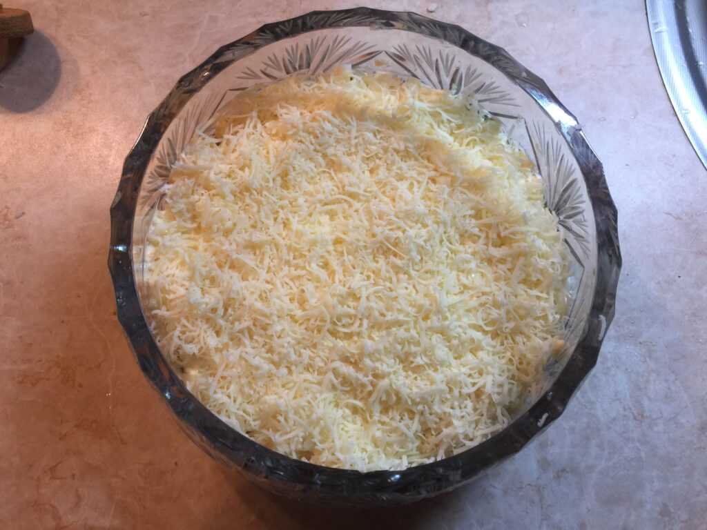 - Тёртый сыр раскладывается так, чтобы в середине получилось углубление, промазывается слой майонезом.