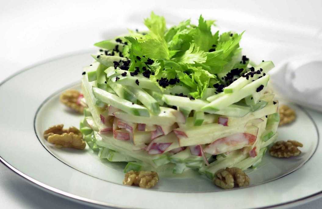 - Измельченный корень сельдерея стеблевого – 100 г, зеленое яблоко – 100 г. Заправить перемешанные ингредиенты несладким йогуртом или нежирной сметаной.