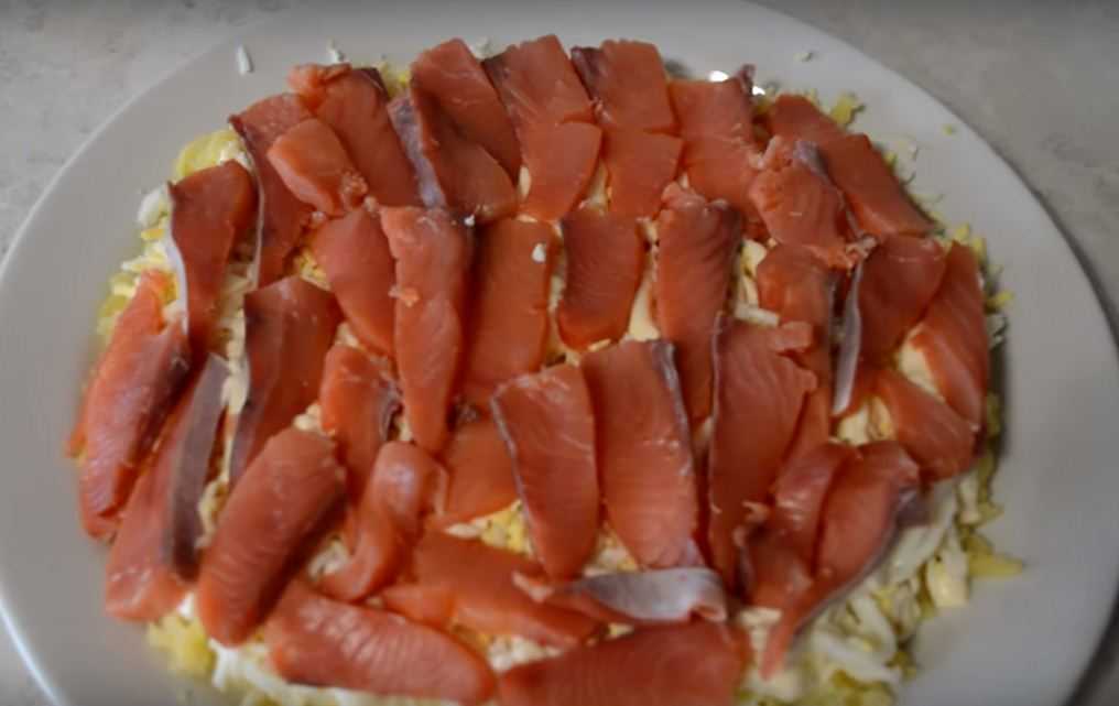 2. Собираю салат в стеклянном прозрачном блюде. Первый слой — красная рыба, ее распределяю по всей поверхности тарелки, по вкусу смазываю майонезом.