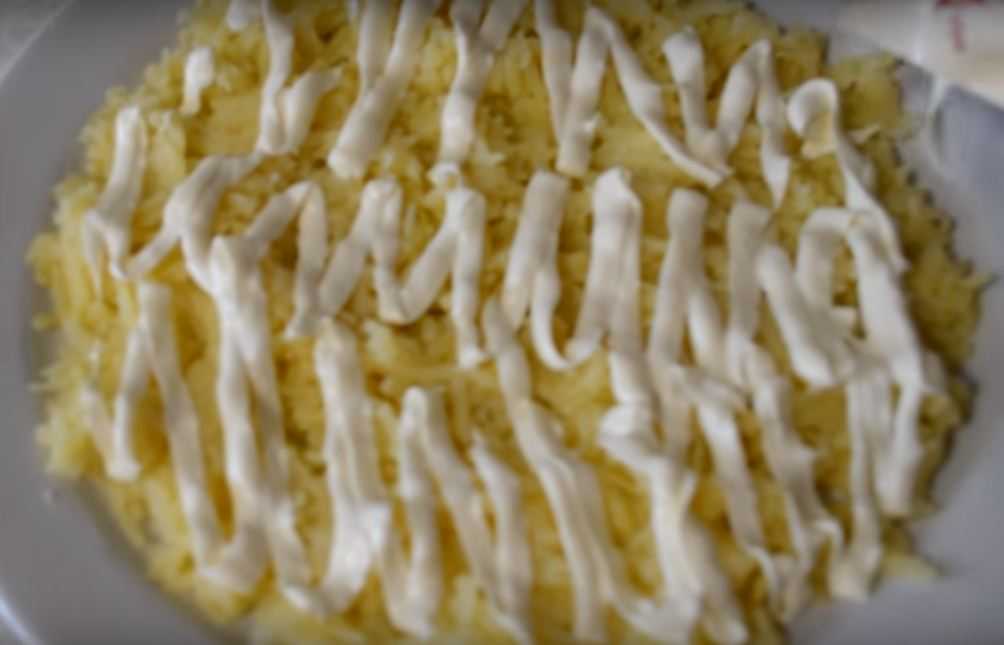 - На плоское блюдо натереть на крупной тёрке белки, нанести немного майонеза.