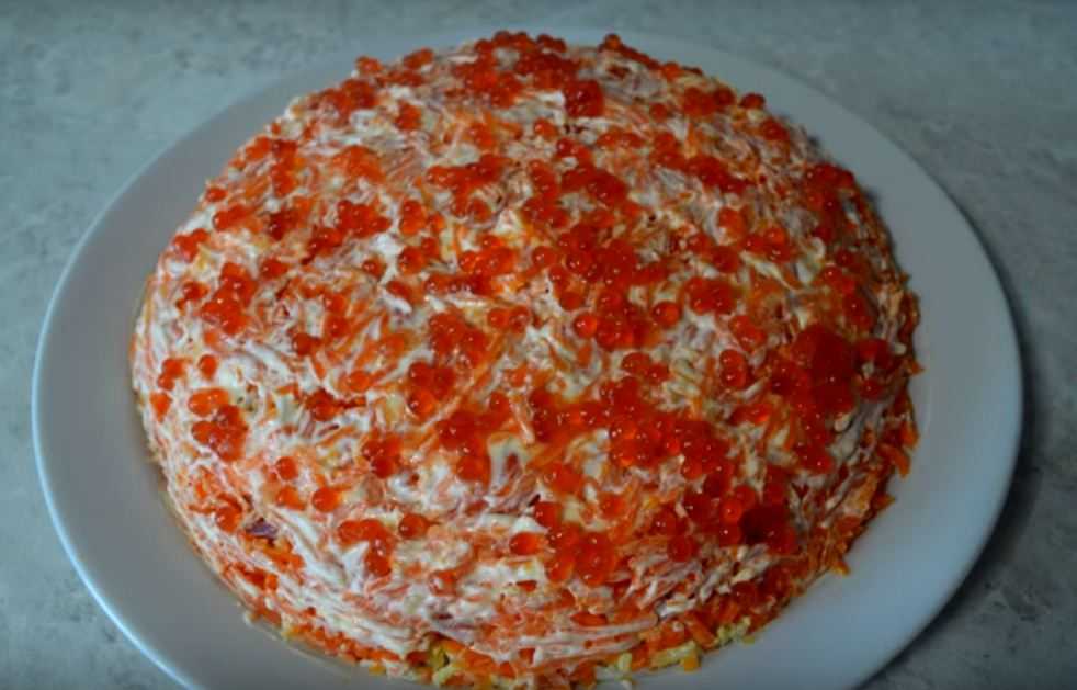 Классический слоёный салат с рыбными консервами и рисом