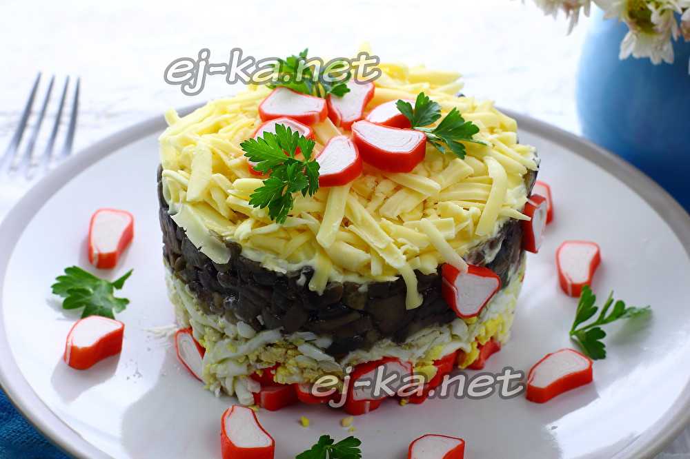В рецепте основные ингредиенты — это крабовые палочки, дополним их жареными шампиньонами, сыром и яйцами. Так как салат у нас слоеный, после приготовления ему лучше дать настояться, хотя бы часик, чтобы все компоненты подружились между собой. Такой салат хорошо сочетается с гарнирами — картофелем или кашей.