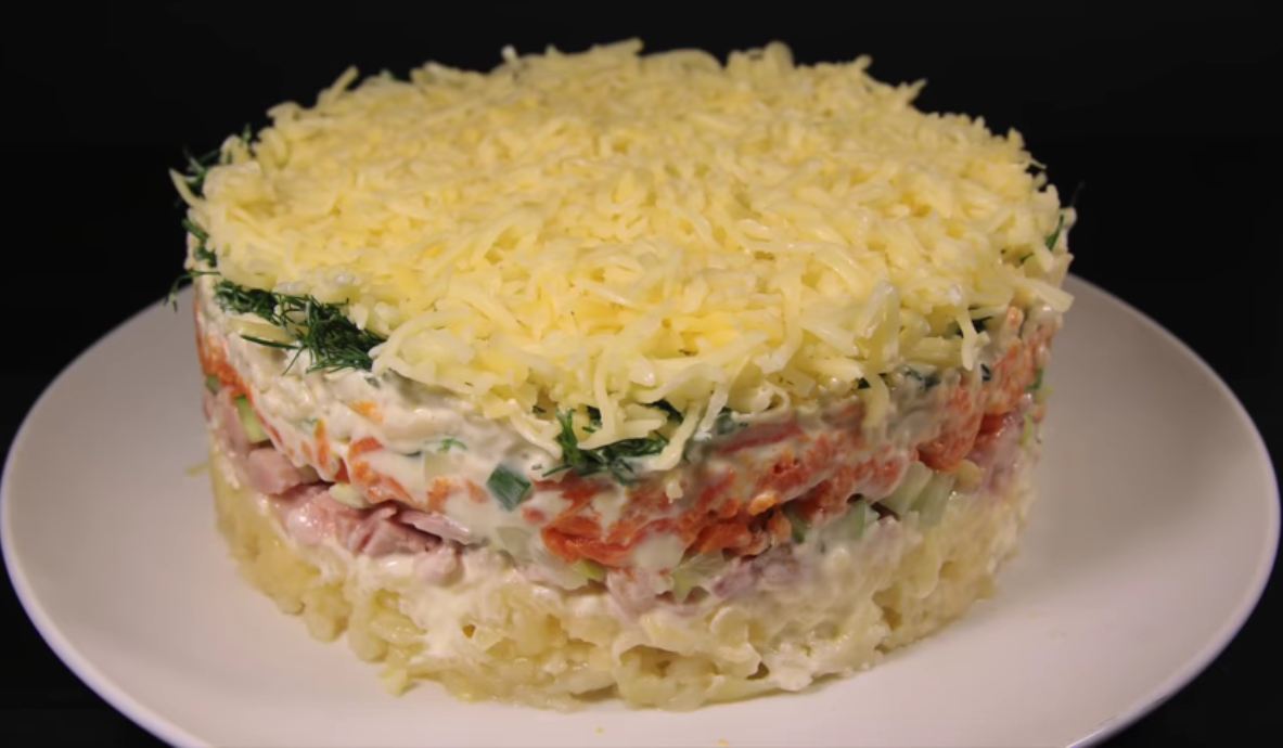 Совет: такой салат нужно делать в широком кольце, так как слоев у него много.