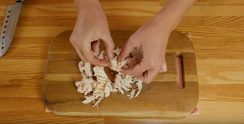 - Курочку разобрала на волокна, можно и нарезать. Но кушанье должно получиться воздушным, поэтому лучше все же разбирать