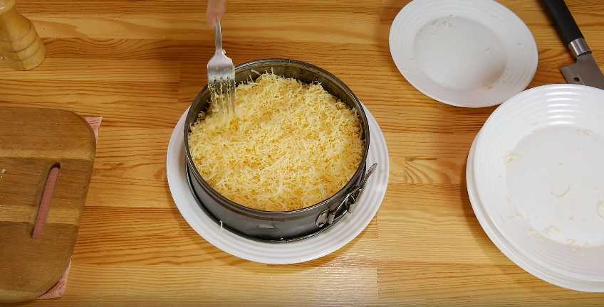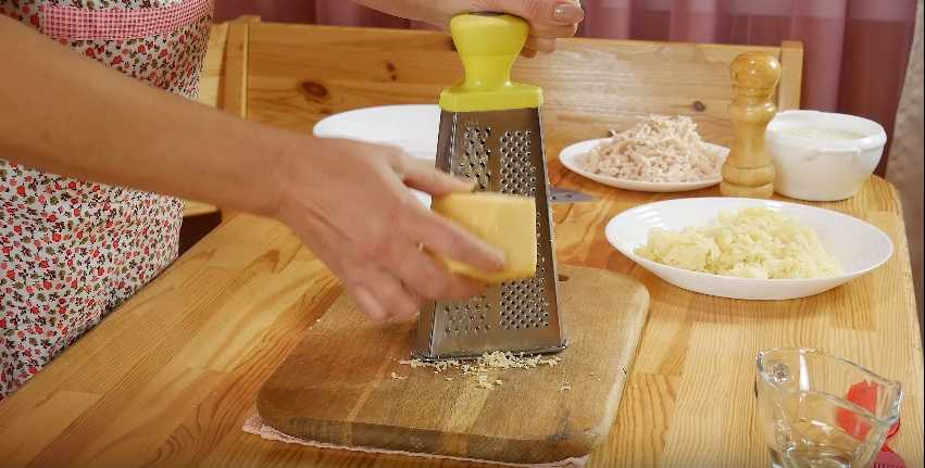 8.Третий слой состоит из сыра. Для этого слоя сыр можно натереть на крупной терке. А вот для последнего сыр лучше натирать на мелкой терке так он получается более воздушным.