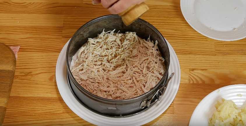 1. Мелко измельчаю куриное бедро, выкладываю ровным слоем по тарелке. Промазываю майонезом и только потом выкладываю маринованный лук.