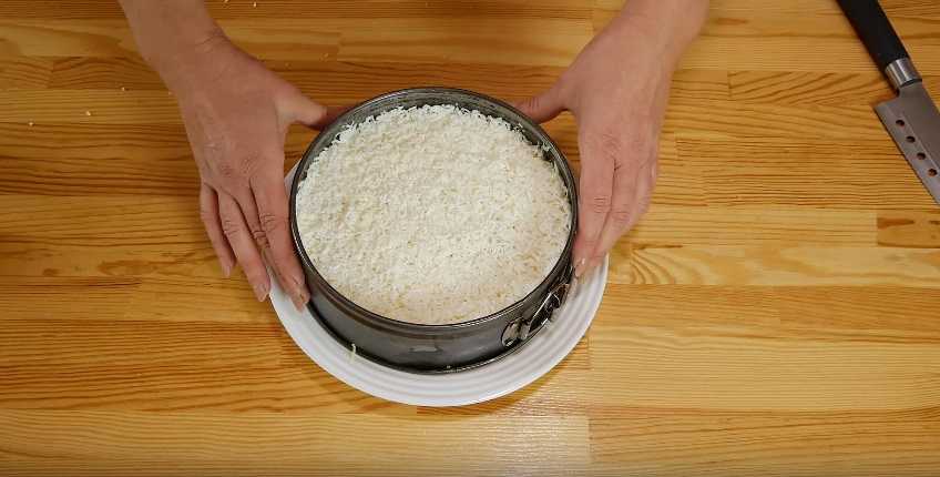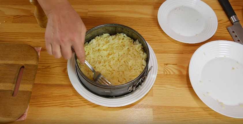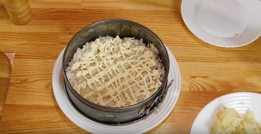 Все слои нужно хорошо промазать майонезом (или сметаной). Чтобы салату придать красивый и приятный вид, воспользуйтесь кулинарным кольцом.