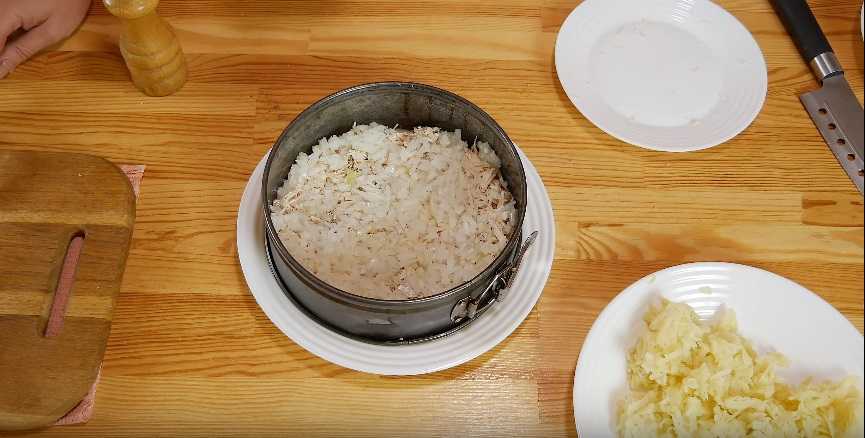 2. Далее за луком на крупной терке натираю картофель. Влажными руками формирую картофель на блюде, сильно не прижимаю. Слой обильно смазываю майонезом.