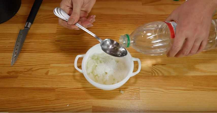 2.Лук очистить нарезать на кубики. Добавить по пол чайной ложки соли и сахара . Залить лук 3 столовыми ложками столового уксуса. Выдержать 10-15 минут. Затем слить рассол.