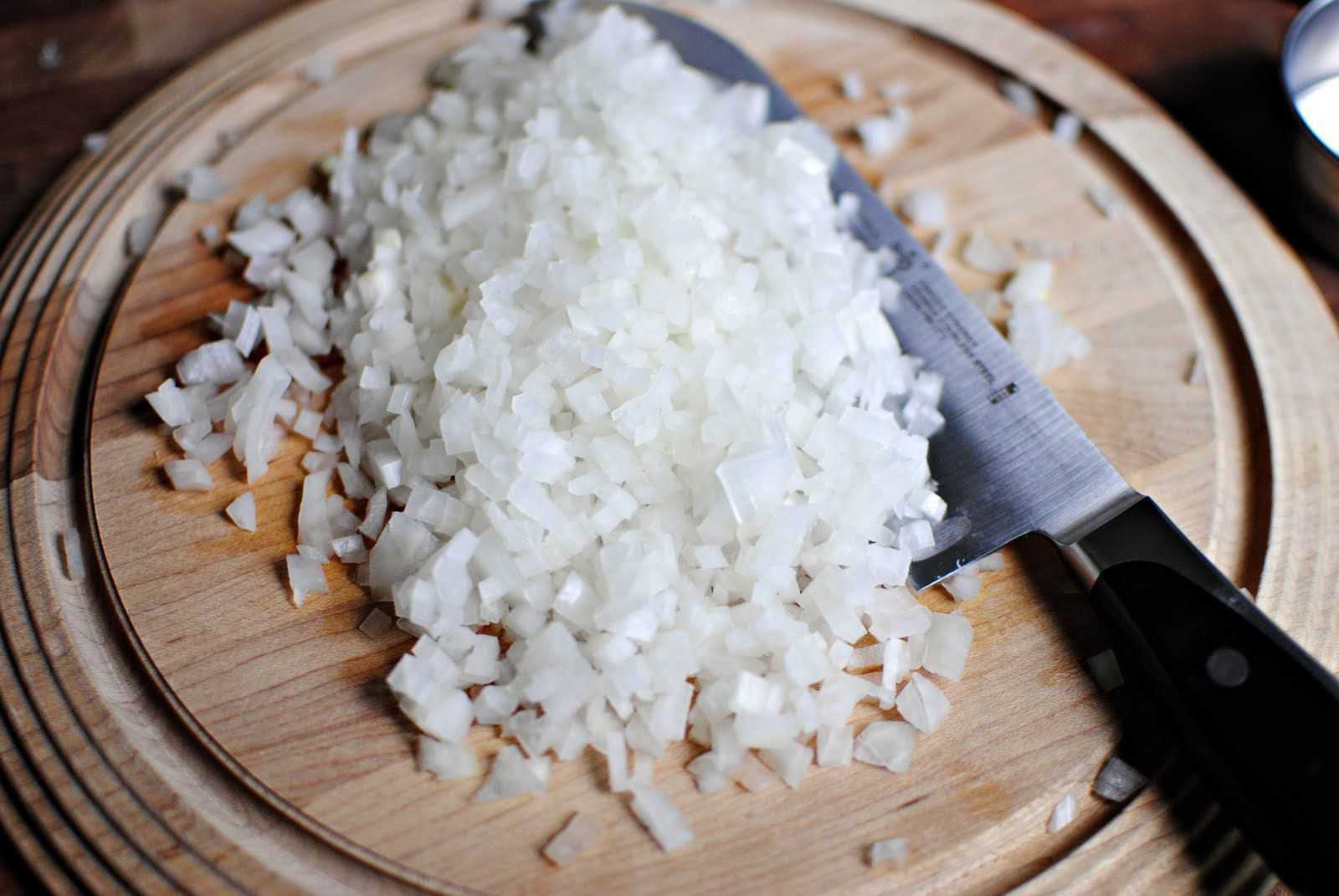 4. За это время очищаем лук от шелухи, мелко его шинкуем и обжариваем с растительным маслом.