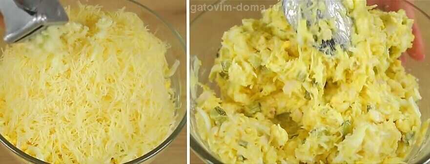 - Отварить яйца и остудить в ледяной воде. Затем натереть отдельно белок и желток.