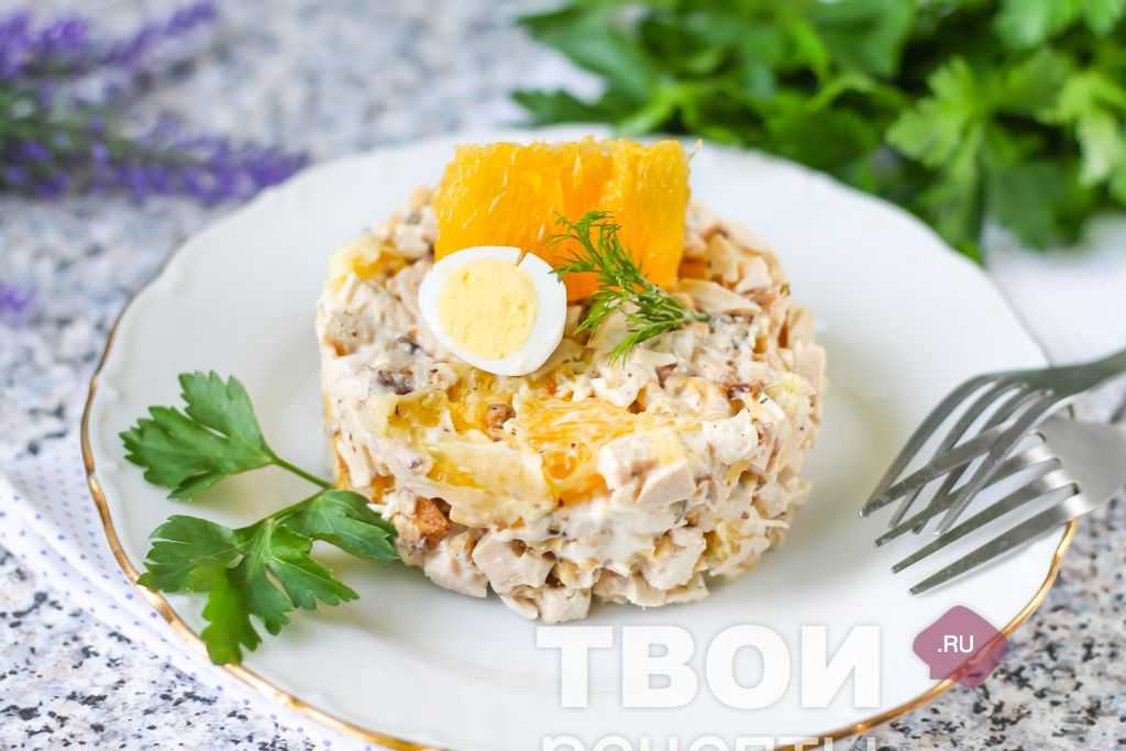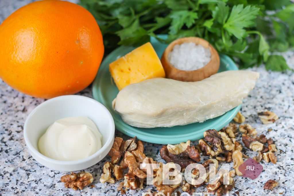 Рецепт 6, пошаговый: салат с курицей, апельсином, орехами
