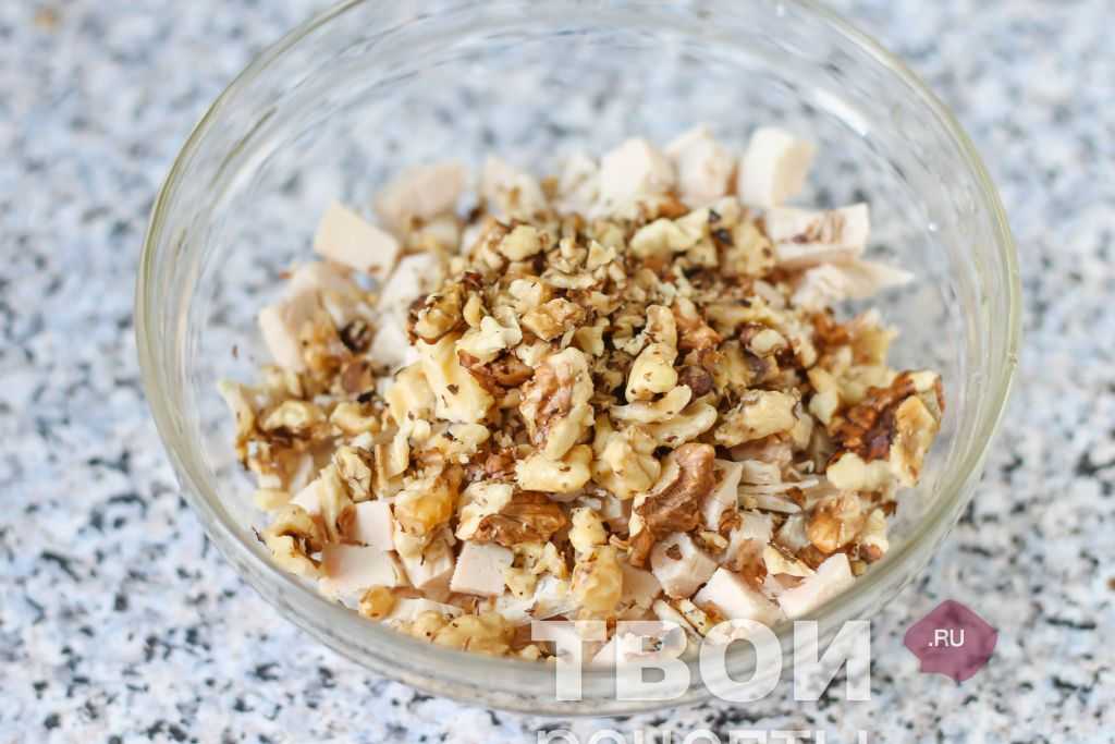 Высыпать измельченный сыр вместе с измельченными орехами в емкость к куриному мясу.