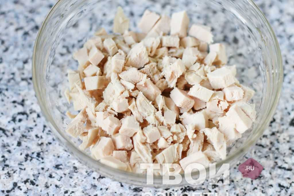 - Подготавливаем основу слоеного салата. Куриное мясо очищаем от кожи, отделяем косточки и некрупно шинкуем;