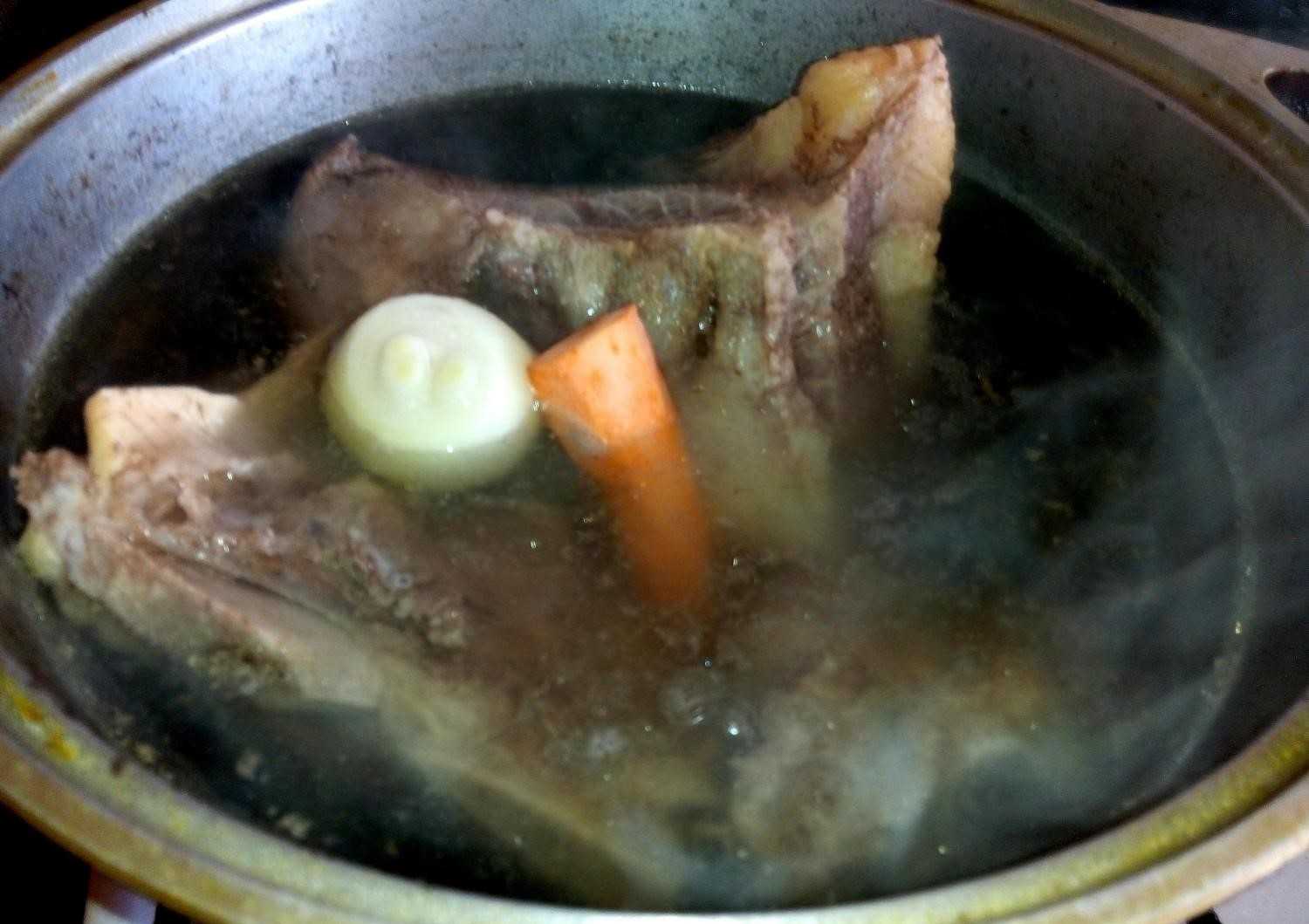 - Говядину залить водой, довести до кипения. Варить 3 ч на маленьком огне, пока мясо не станет мягким и не будет легко отделяться от косточки. Пену нужно постоянно убирать, иначе бульон получится мутным.