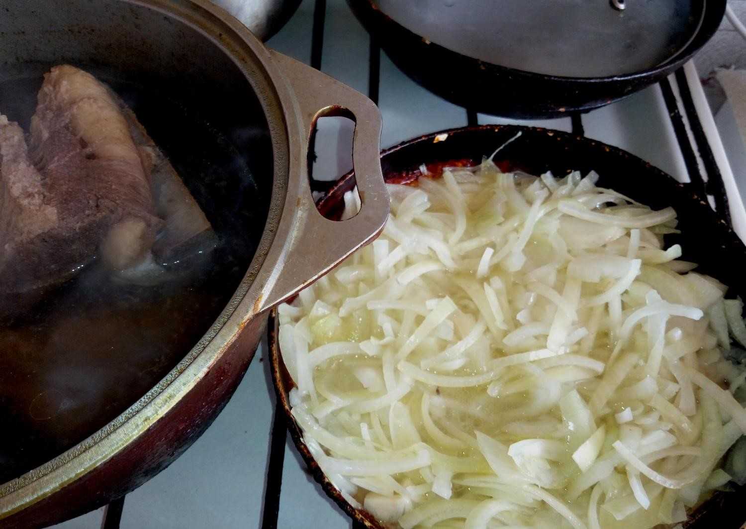 Затем возьмите сковороду, влейте в неё небольшое количество растительного масла и переложите лук на сковороду. Слегка обжарьте его. После возьмите казан и влейте в лук часть мясного бульона. Дайте протомиться до тех пор, пока овощ не станет прозрачный и золотистый.