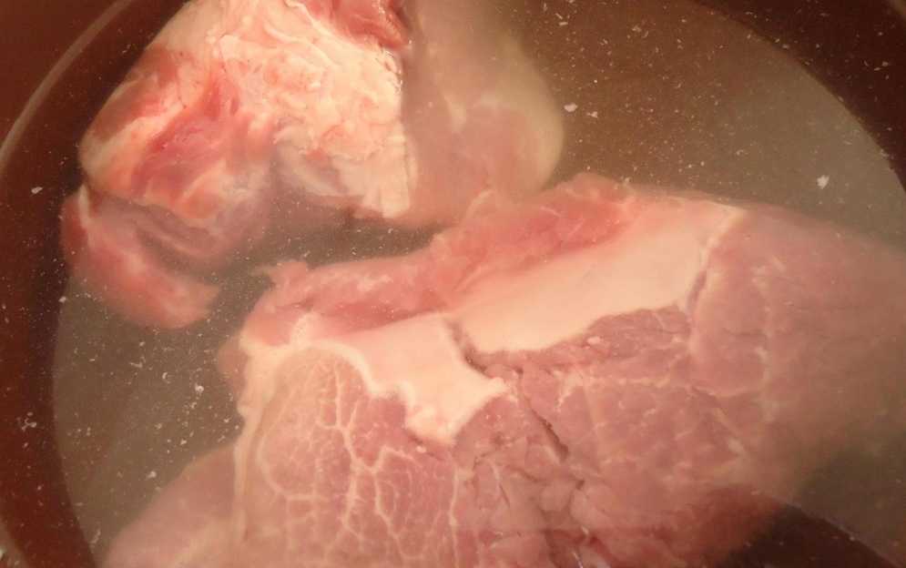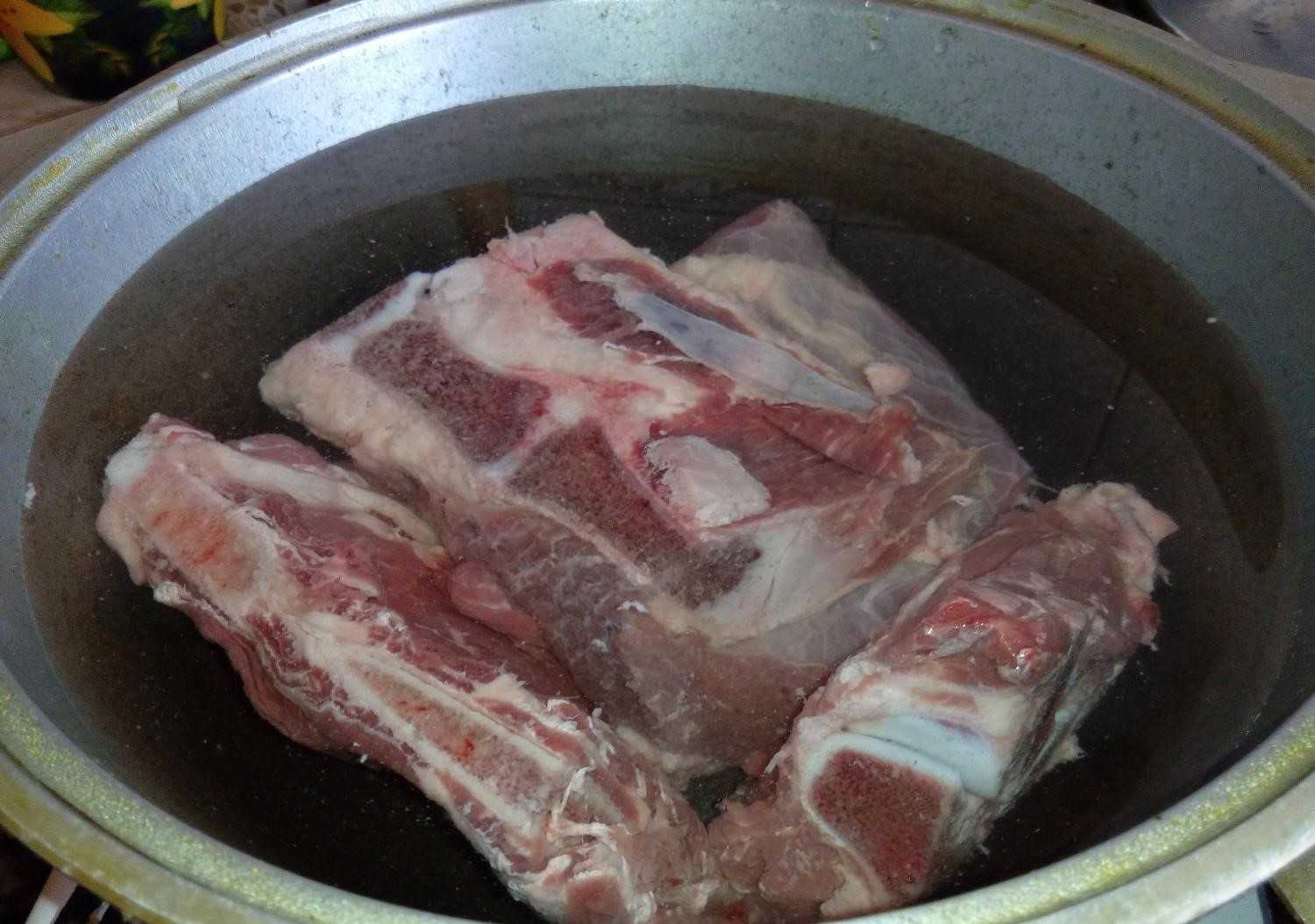 Всё мясо выкладываем в глубокую кастрюлю и заливаем его холодной водой на ночь, держим в прохладе.