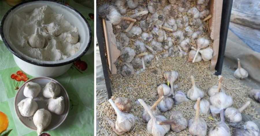 Чеснок может храниться уложенным в трехлитровые стеклянные банки с мукой. В этом случае он кладется вверх остатками стебля. Каждый слой продукта засыпается мукой. Емкость с чесноком должна стоять в прохладном месте.