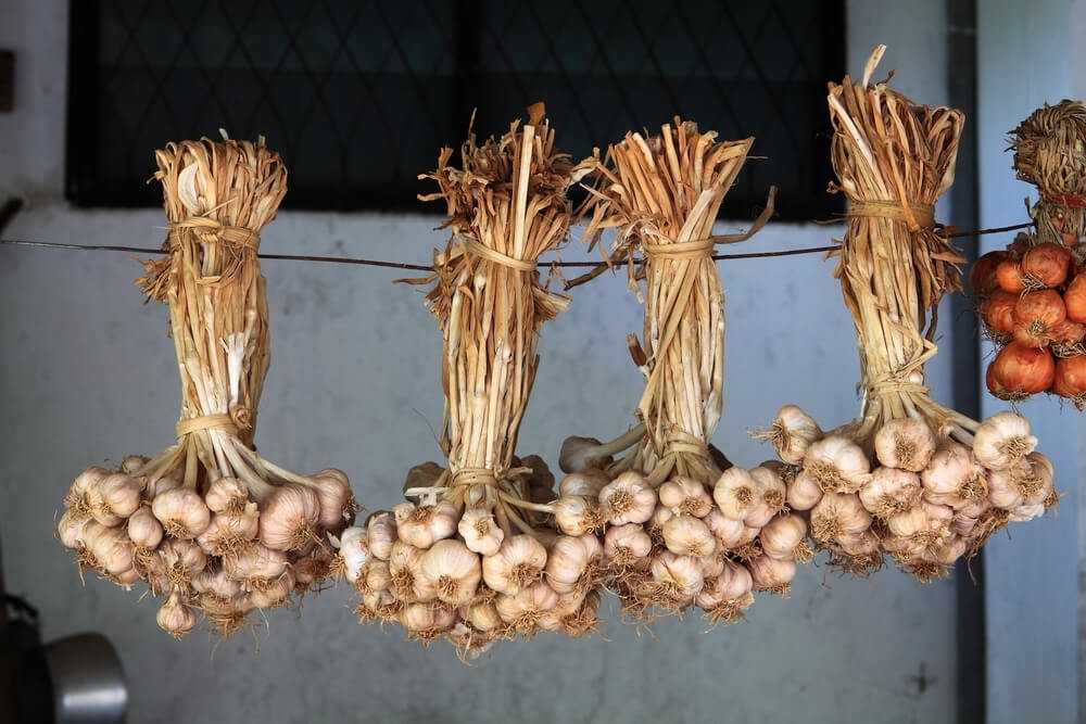 сушка. После того, как урожай собран (послы выкапывания и очищения), его нужно оставить в сухом помещении на несколько дней для подсушивания. Обычно на это уходит 5-7 дней. Сушить овощи следует, подвесив ботвой к потолку. Так, питательные вещества, которые содержатся в стеблях, пойдут в головки, а овощи сохранят свой вкус и полезность;