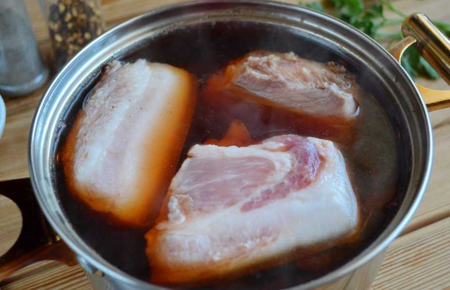 - Теперь нужно повторно вскипятить содержимое кастрюли, отправить в неё грудинку и варить её в течение 5-7 мин. после закипания. После этого требуется выключить огонь и оставить на 16 ч. при комнатной температуре.