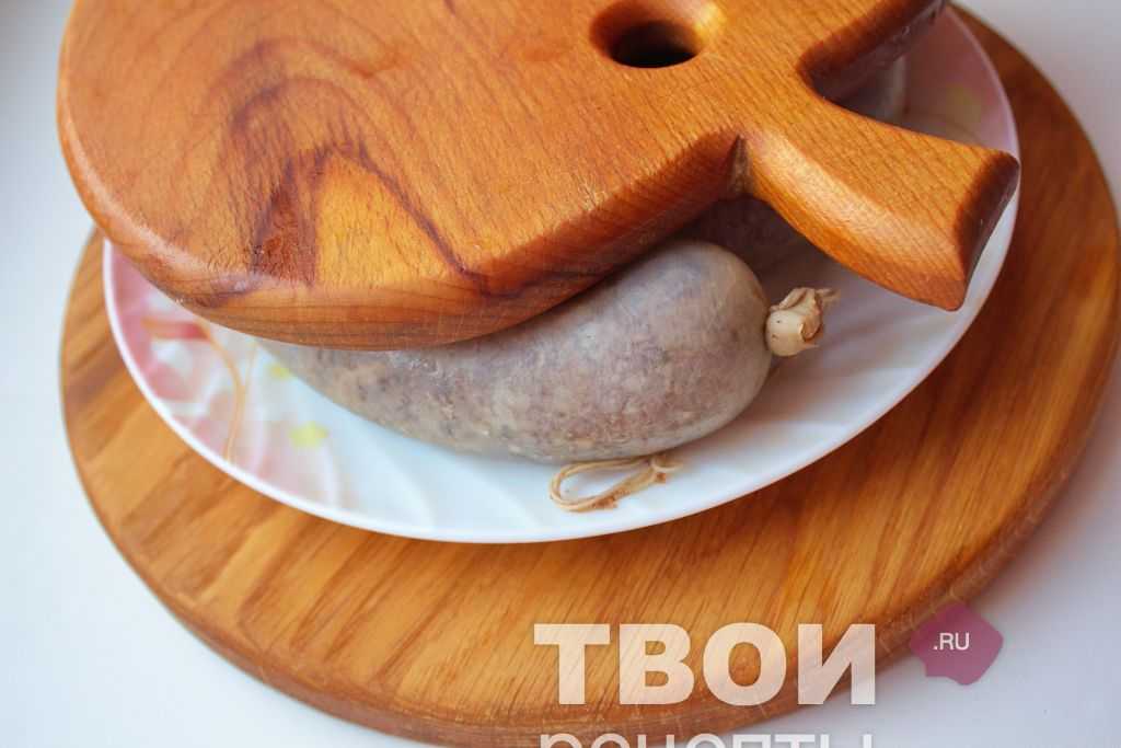 - Куриную смесь плотно переложить в очищенный и подготовленный свиной желудок или кишечник, или специальную колбасную оболочку, завязать отверстие и поместить в холодильник на ночь, установив сверху груз в виде подручного тяжелого предмета.