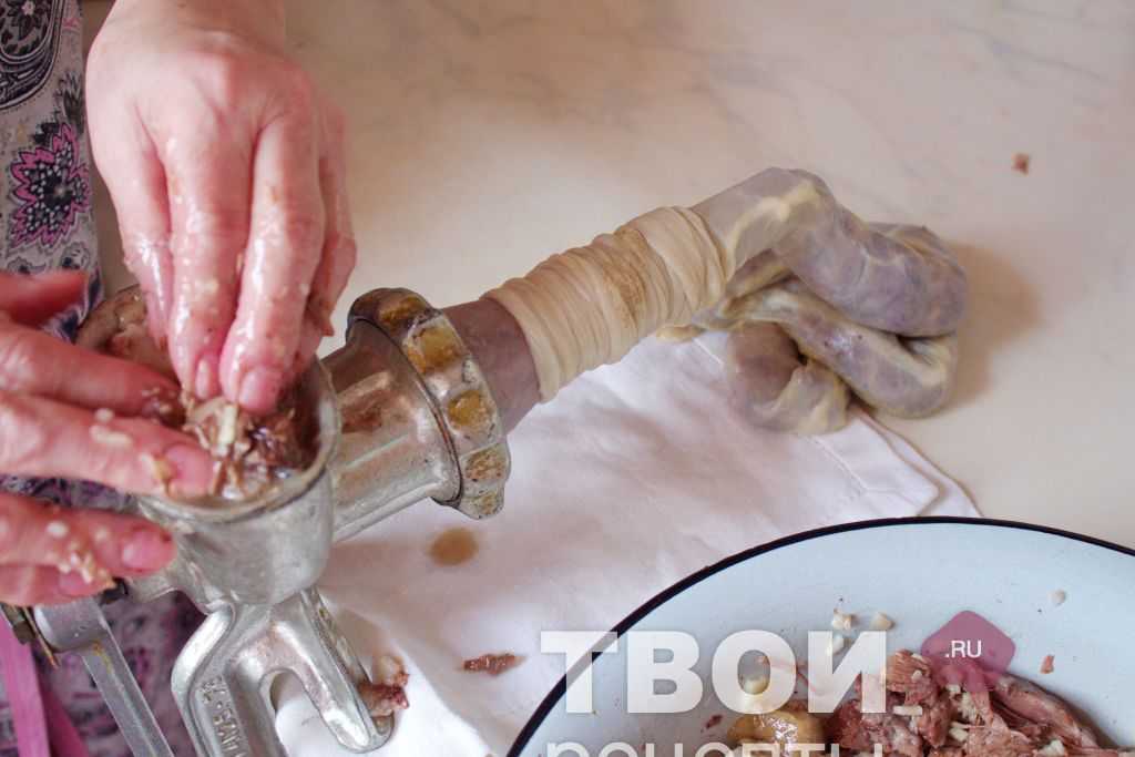 Смешать мясную начинку с подготовленным желатином. На мясорубку без ножа надеть наконечник для начинки колбас — забить кишки плотно полученным мясом и жиром.