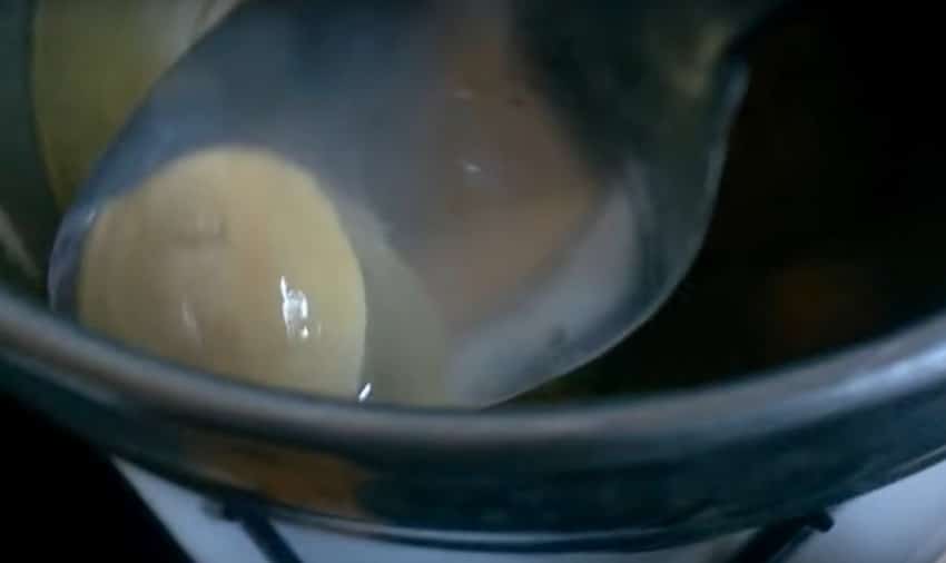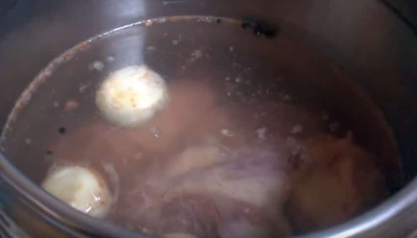 После закипания воды в кастрюле важно вовремя уменьшим огонь, чтобы вода не сильно кипела и собрать на поверхности воды пенку, так как если этого вовремя не сделать, бульон получится более мутным.
