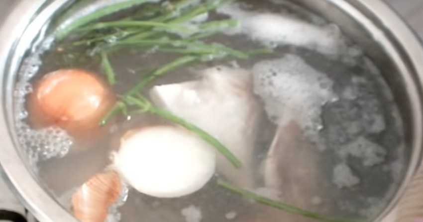 - В закипевшую воду (2 л) опускают голову карпа, луковицу. Солят и перчат. Варят базовый бульон в течение 60 минут.