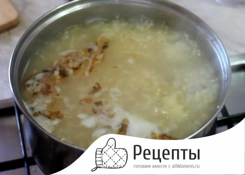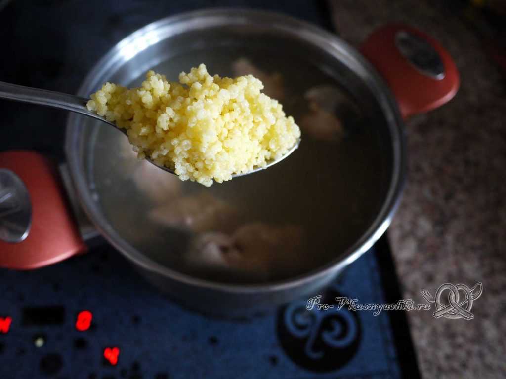 - Три ложки пшена промывают, пока стекающая вода не станет прозрачной. Добавляют в суп.