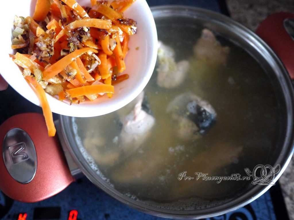 4. Добавляем морковь в бульон и следом отправляем целую луковицу. Она нужна нам только на время варки. После ее нужно будет выкинуть.