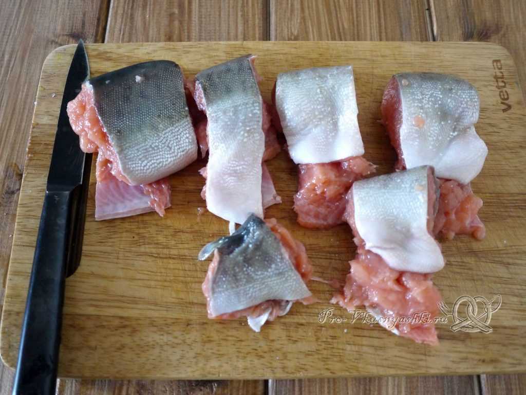 - Очистите и помойте форель, оставив нетронутой кожицу. Нарежьте рыбу крупными кусками.