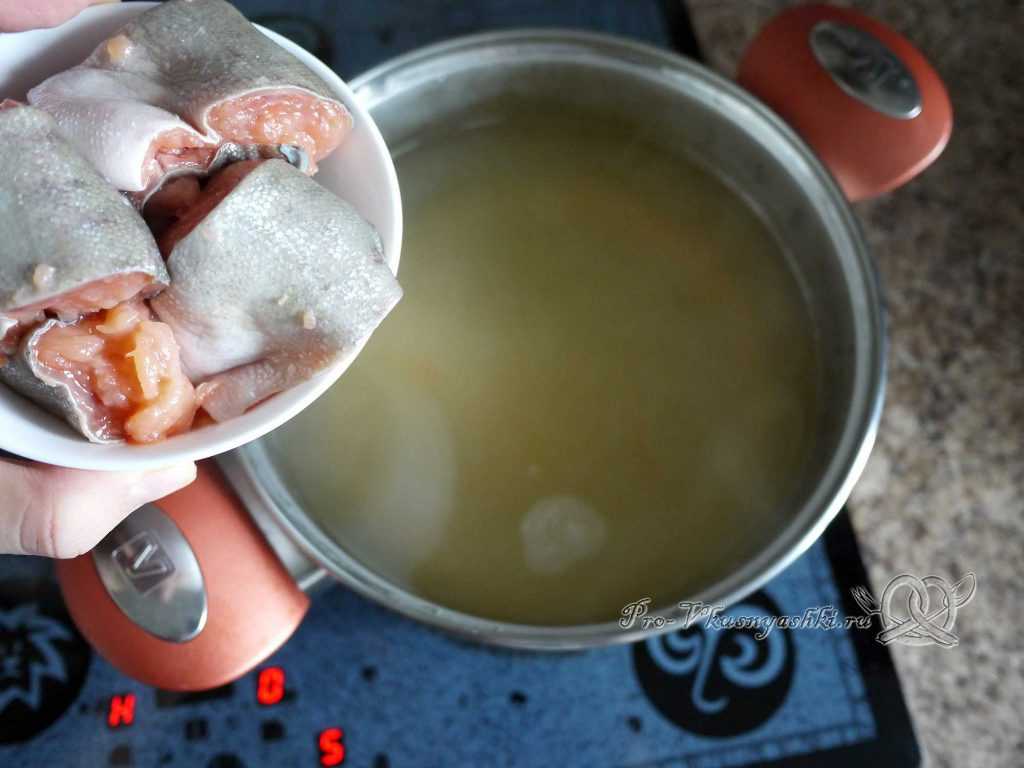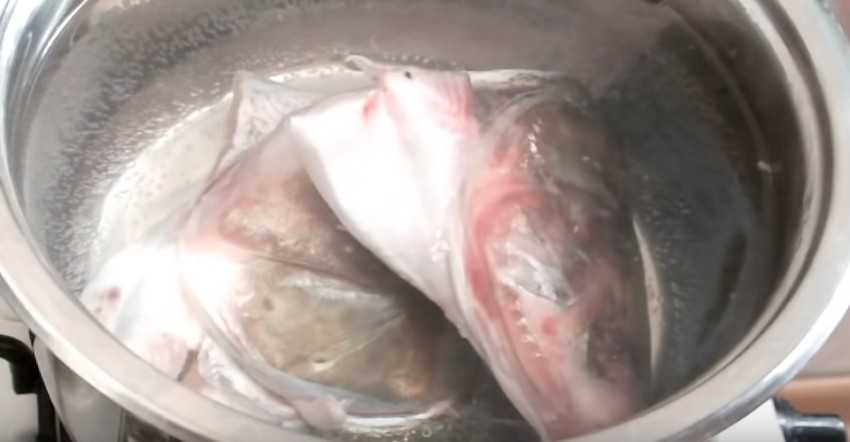 - Сложите части рыбы в кастрюлю и залейте водой. Варите до тех пора, пока кости не начнут легко отделяться от рыбы.
