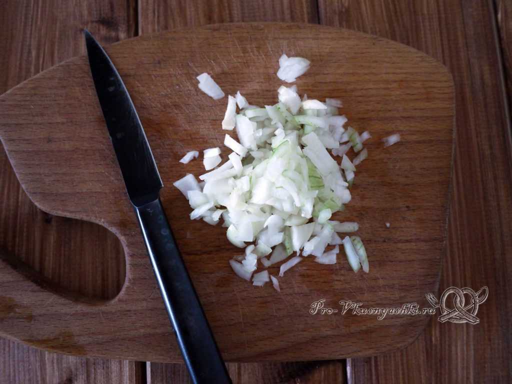 Мелким кубиком нарезаем репчатый лук (50 г).
