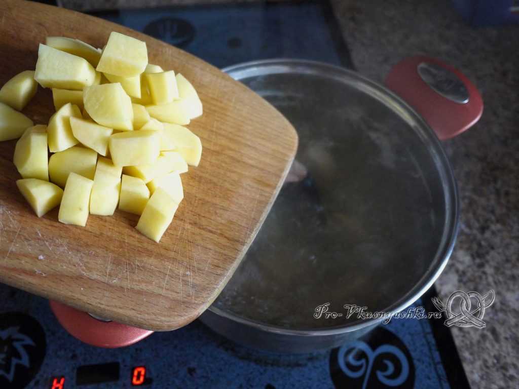 - Картофель режем на кусочки произвольной формы. Перекладываем в кастрюлю с водой и ставим вариться на средний огонь.