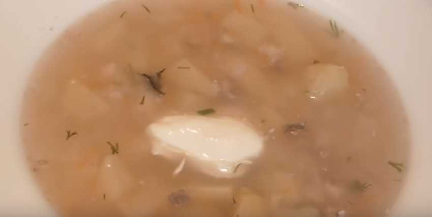 - Высыпают в отвар промытое пшено. Через 10 минут заправляют лимонным соком и лавровым листом. Продолжают варить ещё 5 минут. Вливают сметану.