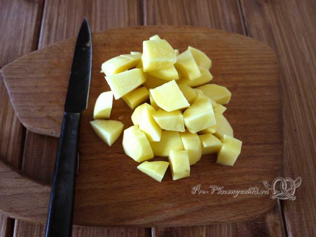 2. Картофель режем на кусочки произвольной формы. Перекладываем в кастрюлю с водой и ставим вариться на средний огонь.