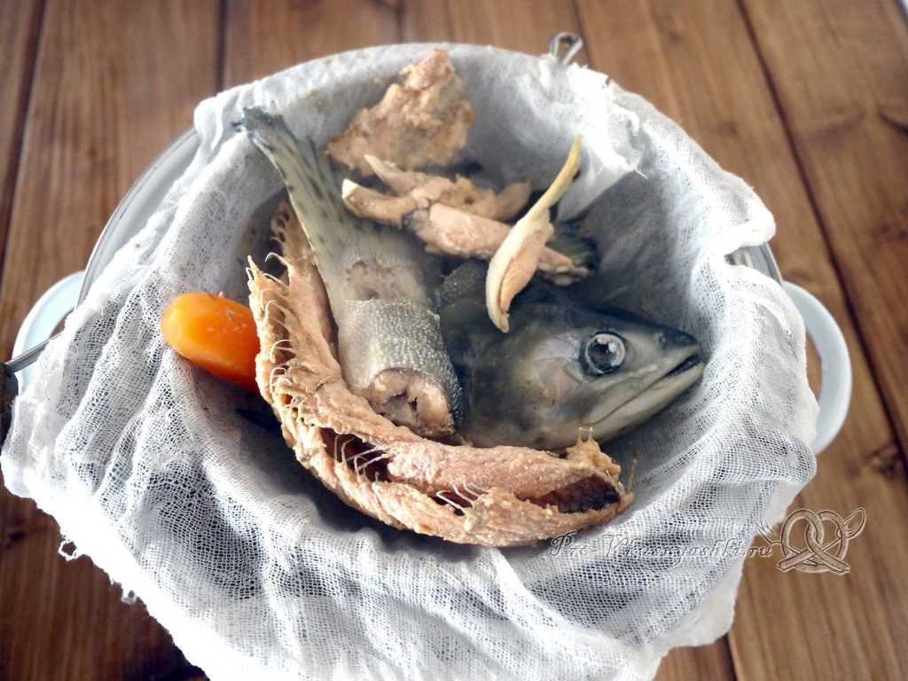 - Очистите и разделайте на филе рыбу. Уложите в кастрюлю головы, хребты, кости, плавники и варите бульон.