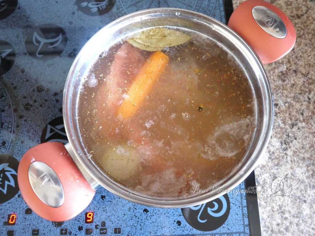 - Когда закипит, добавьте корень петрушки, лук и морковь, лавровый лист.