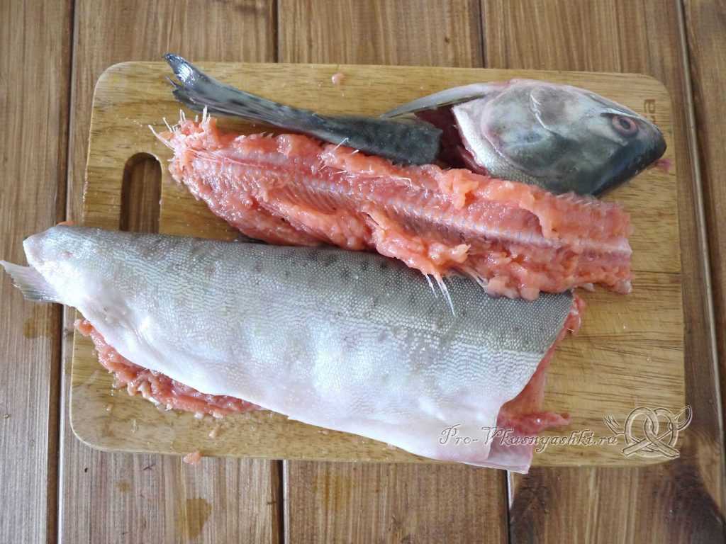Отрезаем от горбуши хвост, голову и плавники. Затем отделяем филе от костей.