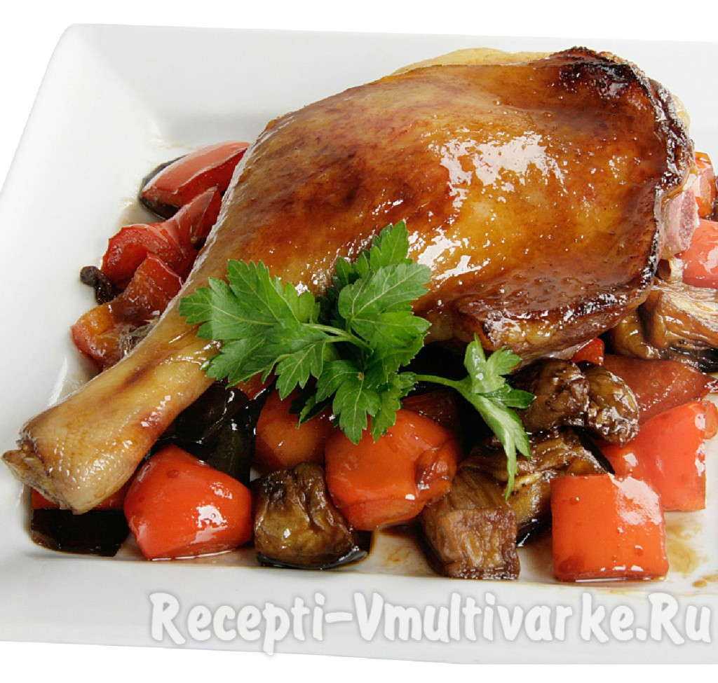По окончании времени готовки, выкладываем утиные ножки с овощами, приготовленные в мультиварке, на тарелки по порциям, и угощаемся!