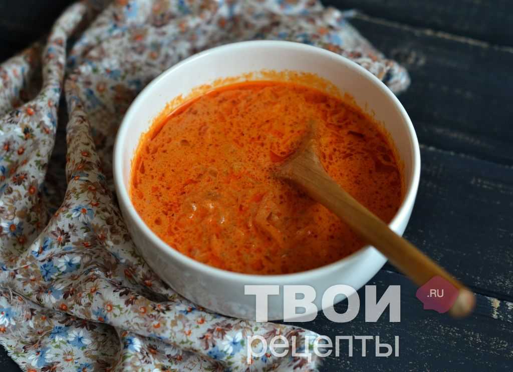 Обжарить лук и морковь на растительном масле 2-3 минуты. Добавить томатную пасту, немного воды и готовить на небольшом огне 10 минут. Затем добавить сметану, соль, специи. Довести до кипения, снять с огня.