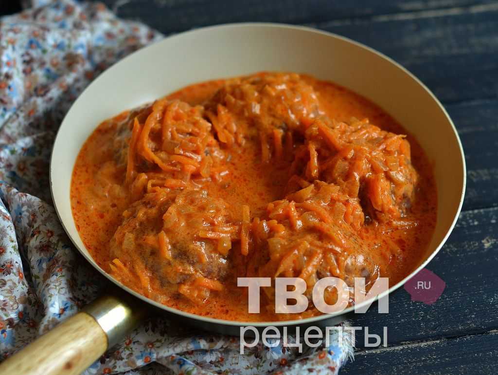 Залить тефтели соусом. Вернуть сковороду на огонь. Если соус очень густой, добавить воды. Готовить под крышкой на небольшом огне 40 минут.