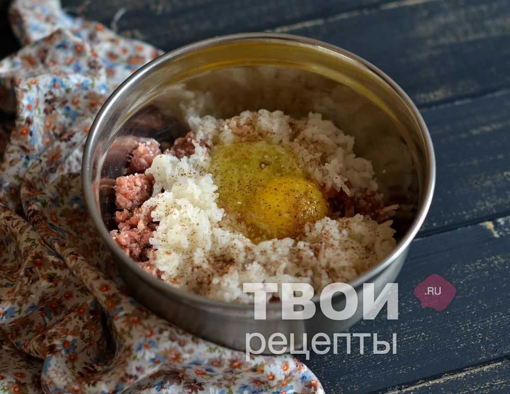 Шаг 3. Когда крупа слегка охладится – смешиваем ее с фаршем, яйцами, мелко порубленным луком, солью, перцем и любимыми специями.
