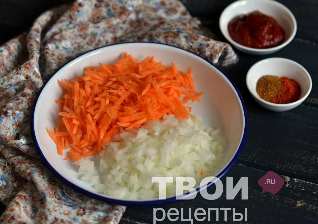 Шаг 1. Очищаем овощи и натираем морковку на мелкой терке, а лук (150 грамм) мелко шинкуем.