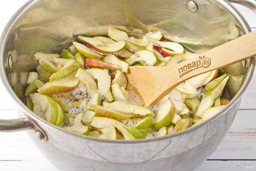 2. Хорошо промойте яблоки, удалите сердцевину, любые повреждения и помятости. Нарежьте тонкими дольками толщиной по 7-8 мм. Сложите ломтики в кастрюлю и засыпьте сахаром
