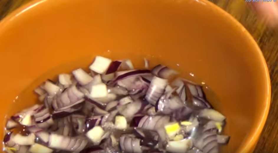 Лук почистить, мелко порезать и замариновать уксусом разведенным водой 1:1, пусть постоит минимум 20 минут, можно и больше.