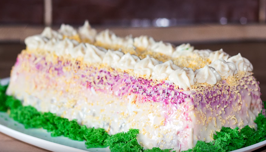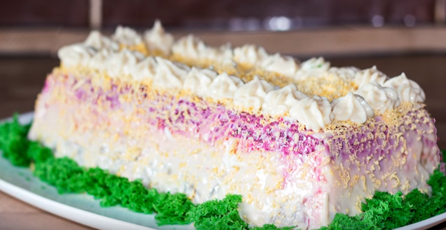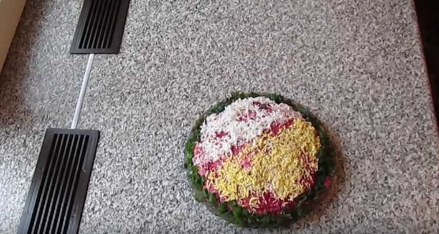11. Прикройте пищевой пленкой и уберите на пару часов в холодильник. Затем уберите пленку, положите сверху сервировочную тарелку и переверните. Аккуратно снимите форму и аккуратно снимите пищевую пленку с салата.Можно оставить салат в таком виде, чтобы было видно слои, а можно аккуратно палеткой или ножом распределить по салату тонкий слой майонеза.