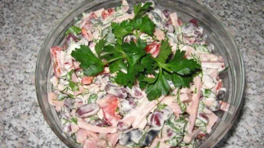 Рецепт салата с колбасой и консервированной фасолью
