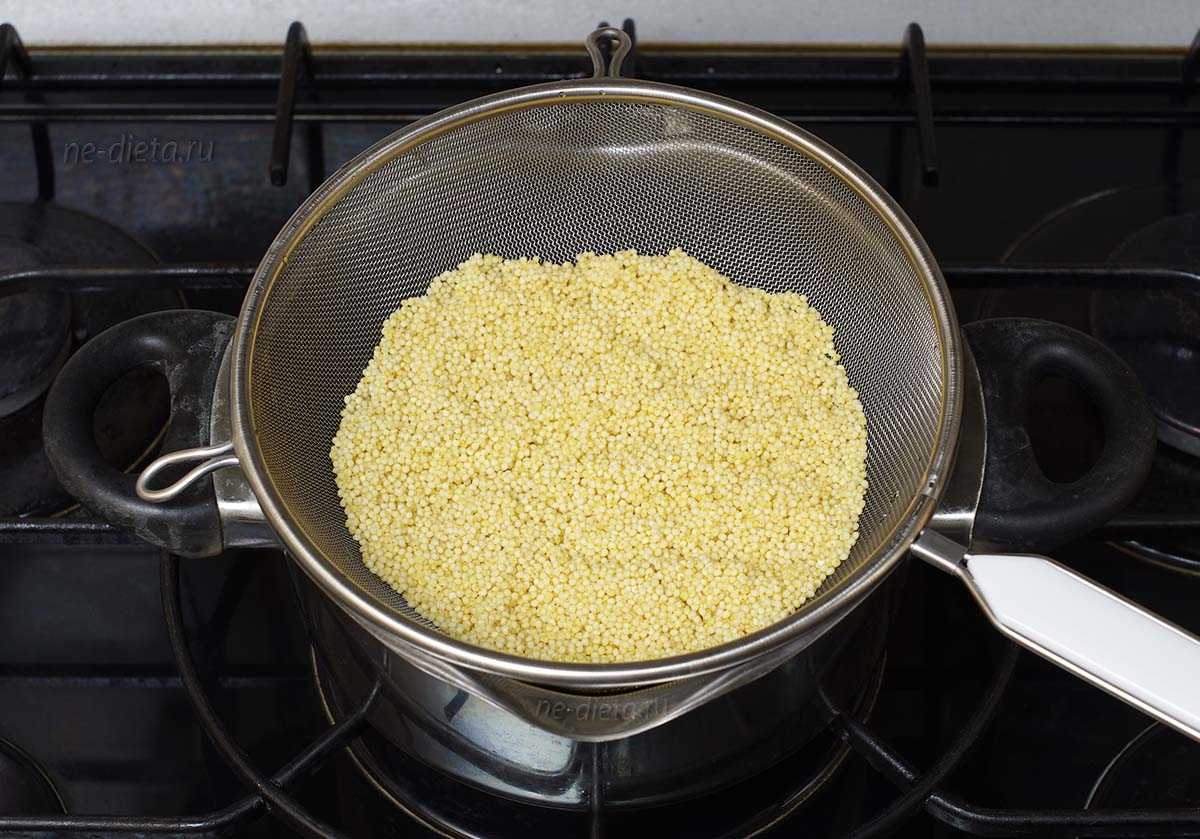 - Во время закипания воды подготавливаем пшено к варке, промывая его;